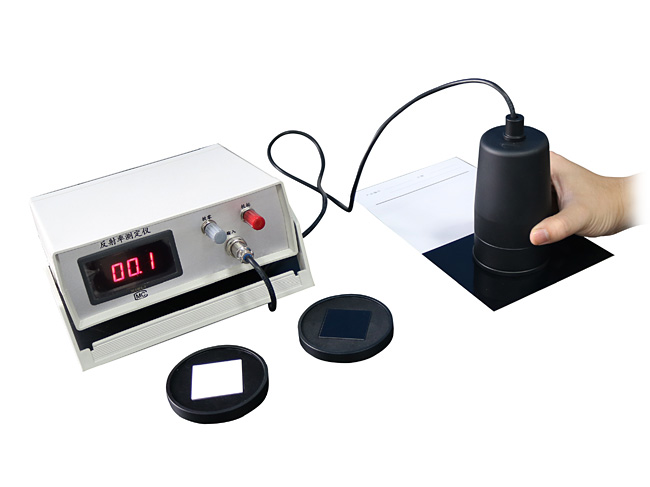 KRJ733 反射率测定仪符合GB/T 23981.1-2019《色漆和清漆 遮盖力的测定 第1部分:白色和浅色漆对比率的测定》中反射率法的要求,该仪器由探头、主机、标准板(黑白各一块)、工作陶瓷板(黑白各两块)等组成。探头采用0°照射、45º接收的原理,当试样的反射光作用于硒光电池表面时产生电信号输入直流放大器进行放大,并予以读数显示。仪器示值与受试表面反射光强度成正比。